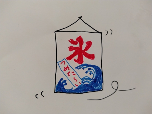 カフェの店先で揺れるこの旗を